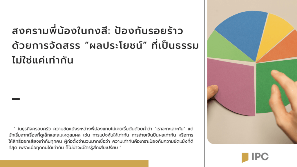 ในท้ายที่สุด ธุรกิจครอบครัวที่ยั่งยืนไม่ได้อยู่รอดเพราะทุกคนได้เท่ากันแต่เพราะทุกคนเชื่อว่าระบบนี้ยุติธรรมพอที่จะอยู่ร่วมกันได้ในระยะยาว ความเป็นธรรมที่ออกแบบอย่างรอบคอบจะช่วยป้องกันไม่ให้ความแตกต่างกลายเป็นรอยร้าว และช่วยให้พี่น้องสามารถทำงานร่วมกันได้แม้ในวันที่มีความเห็นต่าง
