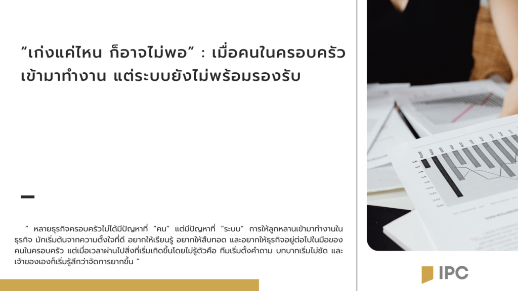หลายธุรกิจครอบครัวไม่ได้มีปัญหาที่ “คน” แต่มีปัญหาที่ “ระบบ” การให้ลูกหลานเข้ามาทำงานในธุรกิจมักเริ่มต้นจากความตั้งใจที่ดี อยากให้เรียนรู้ อยากให้สืบทอด และอยากให้ธุรกิจอยู่ต่อไปในมือของคนในครอบครัว แต่เมื่อเวลาผ่านไป สิ่งที่