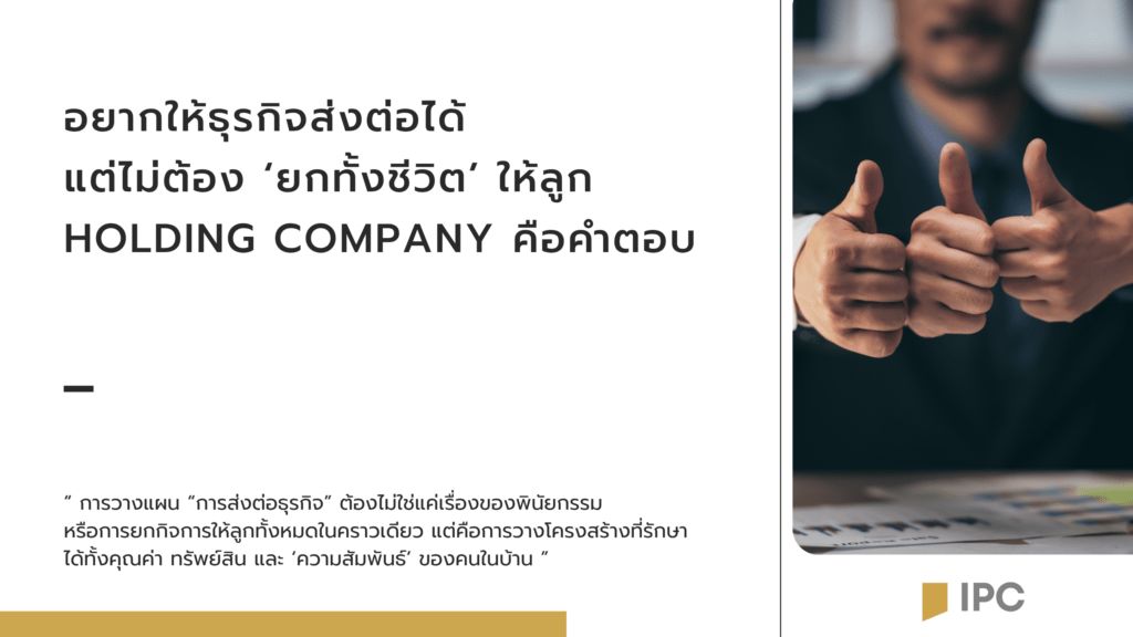 นั่นคือเหตุผลที่การวางแผน “การส่งต่อธุรกิจ” ต้องไม่ใช่แค่เรื่องของพินัยกรรม หรือการยกกิจการให้ลูกทั้งหมดในคราวเดียว แต่คือการวางโครงสร้างที่รักษาได้ทั้งคุณค่า ทรัพย์สิน และ ‘ความสัมพันธ์’ ของคนในบ้านและ Holding Company คือเครื่องมือหนึ่งที่ช่วยให้คุณ “ถอยอย่างสง่างาม” โดยไม่ต้องรู้สึกว่า “เราหมดค่า”