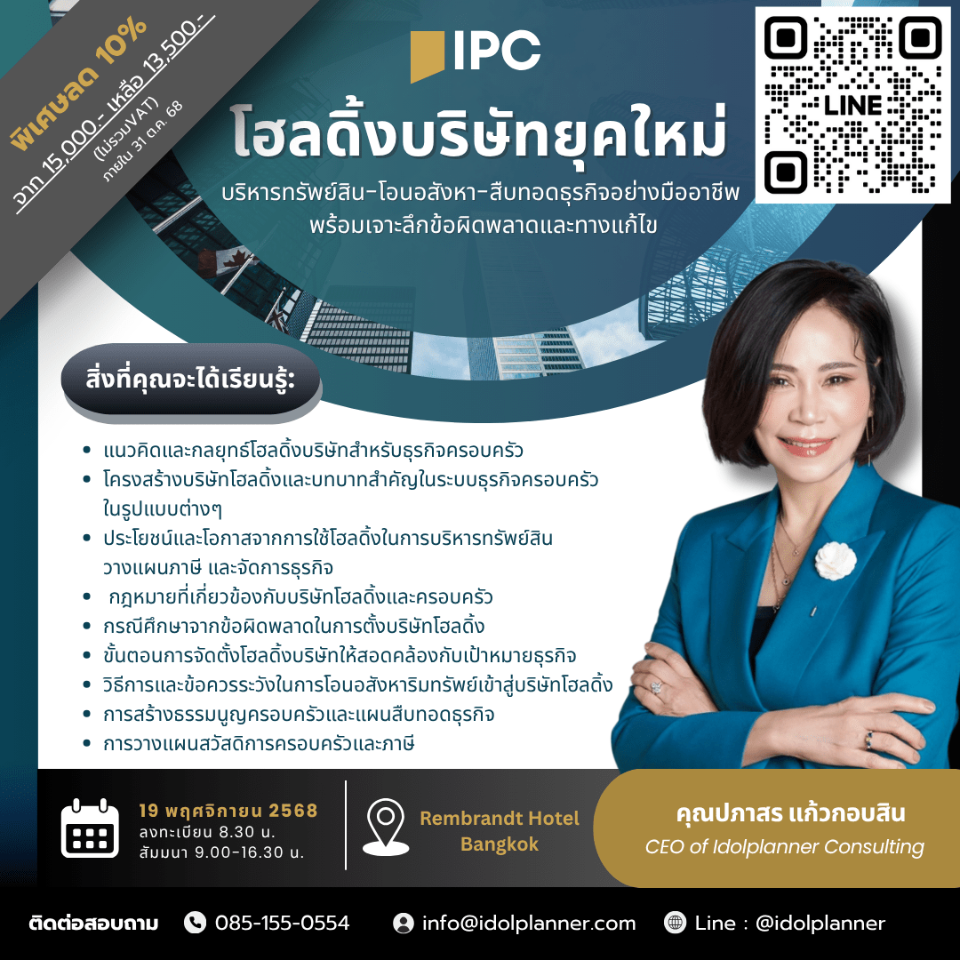 พร้อมวิเคราะห์เคสตัวอย่าง รู้ทันข้อผิดพลาดและแนวทางแก้ไข สำรองที่นั่ง 💰 ราคาปกติ 15,000.-/ท่าน (ไม่รวม VAT)🌟 Early Bird ลด 10% เหลือเพียง 13,500.-/ท่าน (ไม่รวม VAT)(เมื่อสมัครภายใน 31 ต.ค. 2568) 📘 สัมมนาโดยคุณปภาสร แก้วกอบสินที่ปรึกษาธุรกิจครอบครัวและภาษีบริษัท ไอดอลแพลนเนอร์ คอนซัลติ้ง จำกัด (IPC) 💡 สิ่งที่คุณจะได้เรียนรู้ ✅ กลยุทธ์การตั้งโฮลดิ้งบริษัทสำหรับธุรกิจครอบครัว✅ การวางโครงสร้างภาษี–กฎหมาย–การบริหารที่มีประสิทธิภาพ✅ วิธีป้องกันข้อผิดพลาดในการจัดตั้งและโอนทรัพย์สิน✅ การวางโครงสร้างบริษัทโฮลดิ้งและบทบาทสำคัญในระบบธุรกิจครอบครัว✅ การใช้โฮลดิ้งเพื่อบริหารทรัพย์สินและวางแผนธุรกิจอย่างยั่งยืน✅ กรณีศึกษาความสำเร็จและข้อผิดพลาดจากการตั้งบริษัทโฮลดิ้ง✅ การสร้างธรรมนูญครอบครัวและแผนสืบทอดธุรกิจ✅ เทคนิควางแผนสวัสดิการครอบครัวและภาษีอย่างมืออาชีพ 📅 วันพุธที่ 19 พฤศจิกายน 2568⏰ ลงทะเบียน 8.30 น. สัมมนา 9.00–16.30 น.📍 Rembrandt… Continue reading โฮลดิ้งบริษัทยุคใหม่ บริหารทรัพย์สิน – โอนอสังหา – สืบทอดธุรกิจอย่างมืออาชีพพร้อมวิเคราะห์เคสตัวอย่าง รู้ทันข้อผิดพลาดและแนวทางแก้ไข